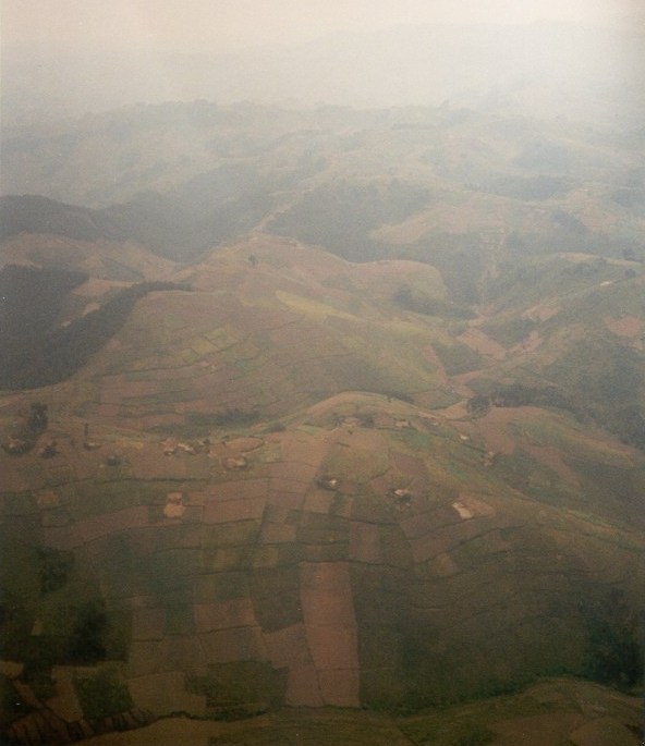 | Since I had seen hardly any animals (that I couldn't see back home on my grandparents' farm) since my arrival in Africa (OK, I saw a Camel in Mombasa), I decided to travel from Cyangugu back to Kigali through the rain forest. Once inside, the temperature drops; even from the road the thick jungle looks foreboding. |  | |
