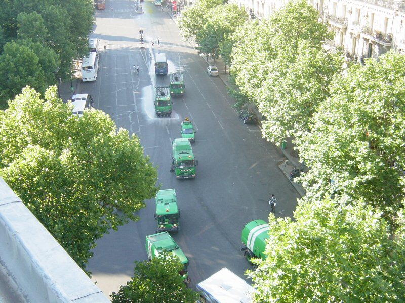 | Before I fly back home from Paris, I see a cavalcade of horses preparing for Bastille Day celebrations later that day. | The chevaux are followed by their own chaperones: a parade of street cleaners. | | |